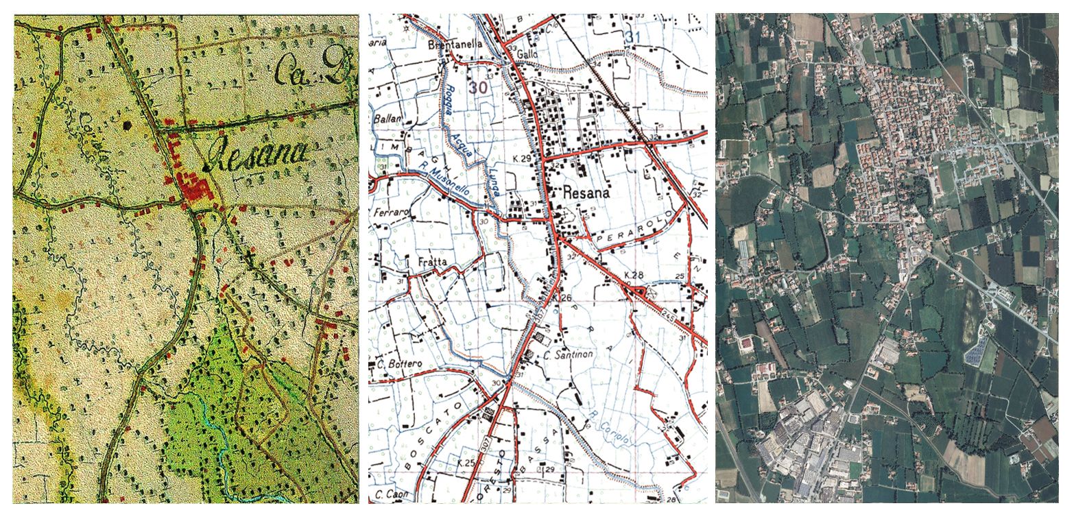 Nel fotopiano 2014 l’urbanizzazione più compatta risulta sviluppata soprattutto a nord del vecchio centro e tra la strada per Castelfranco e la ferrovia, accompagnata da una serie di nuclei sfrangiati. Questo modello di urbanizzazione di bassa qualità, che è tipico degli ultimi cinquant’anni e simile in gran parte delle località del Veneto, è concluso dalla vasta area produttiva verso Loreggia che -malgrado l’infedeltà di significato verso l’antico toponimo- viene denominata Zona Industriale di Boscalto. Sulla strada per Venezia è da notare, a destra nel fotopiano, una non piccola distesa di pannelli fotovoltaici in area agricola. La ricchezza delle acque – malgrado episodi distruttivi come la cancellazione nella zona a nord dell’abitato delle sorgenti del Dese – però è ancora percepibile e la campagna rimasta è ritagliata in grandi insule alberate. I valori e la cura di questi luoghi partono da iniziative presenti nel Comune che riscoprono e indicano i nomi dei siti e la loro storia.